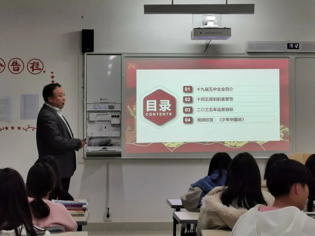 林书记用生动诙谐的语言介绍了十九届五中全会的主要参会人员,会议主要内容以及会议主要规划目标。通过学习,同学们了解了“十四五”规划的宏伟蓝图和“二〇三五”远景目标。