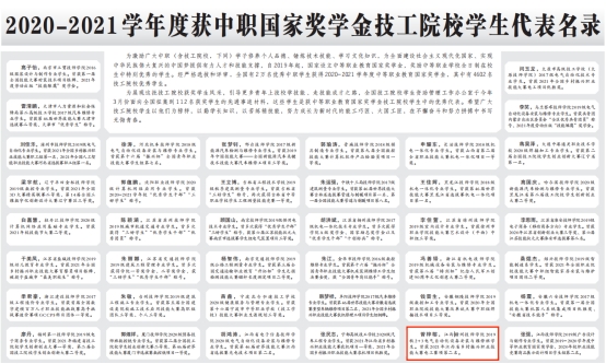 近日,从中国劳动保障报中获悉,我院(江西赣州技师学院)学子曾梓榕是获中等职业教育国家奖学金技工院校学生中的优秀代表,上榜2020-2021学年度获中职国家奖学金技工院校学生代表名录,一展我院学子风采。望学院学子以该生为榜样,志存高远,力争上游!