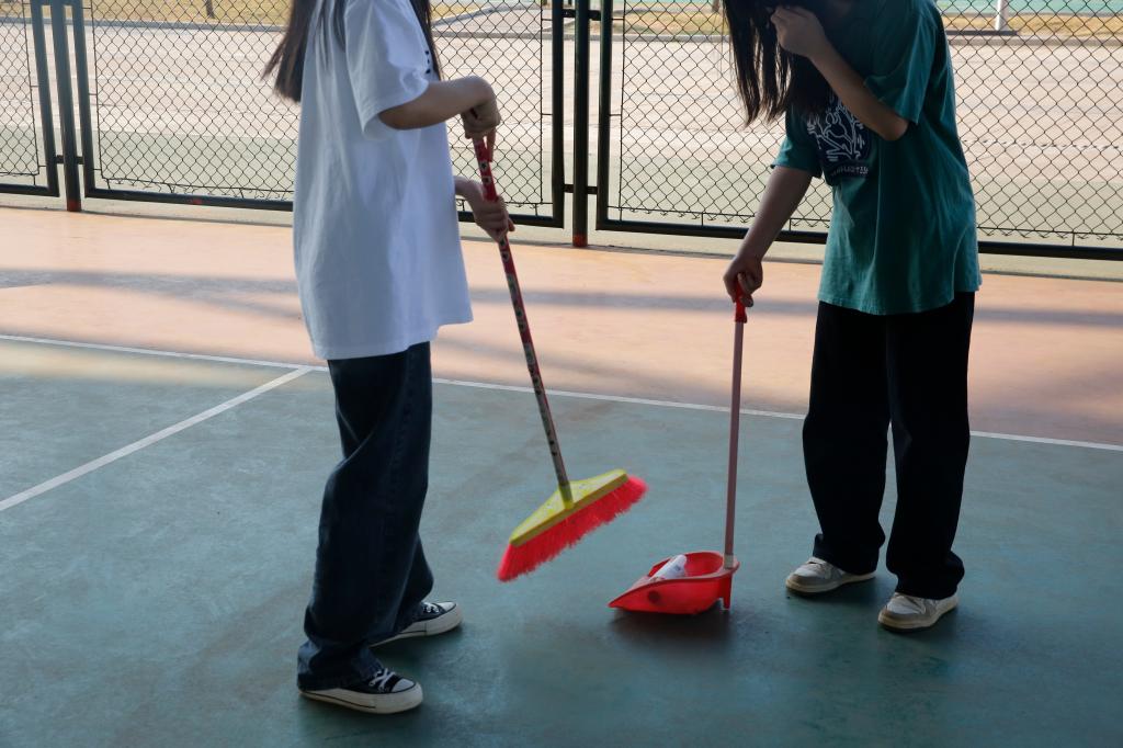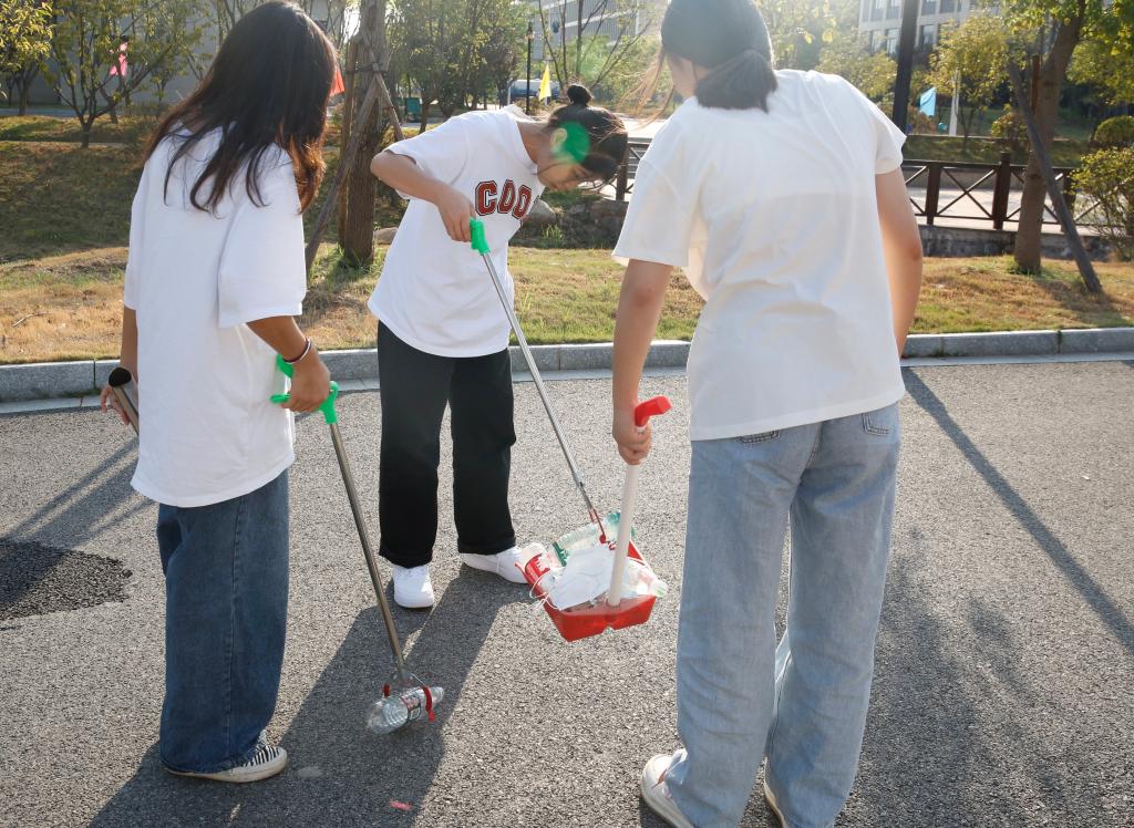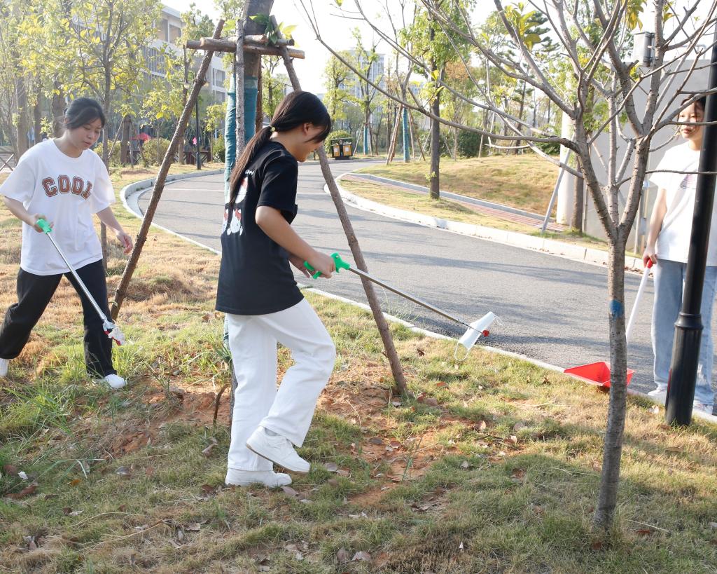 同学们在老师的带领下分工合作,划分打扫区域,对学校南操场周边以及卫生死角进行清除,对散落在绿化带的杂草和白色垃圾进行细致清理,对绿化带中的小树苗进行浇水灌溉护理。