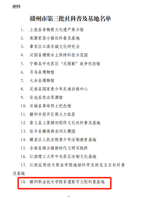 日前,赣州市社科规划领导小组办公室组织开展了第三批市级社科普及基地创评活动,我院由科研处牵头,艺术设计系申报的“非遗数字文创科普基地”获批。