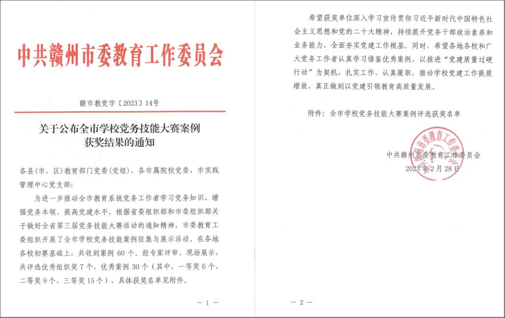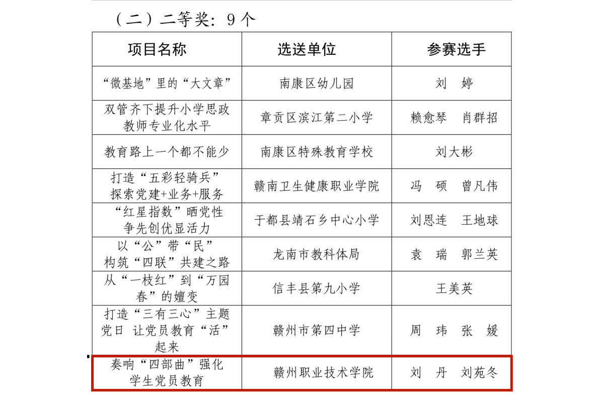 近日,中共赣州市委教育工作委员会公布了2022年度赣州市教育系统党务技能大赛案例获奖名单,由我院思政课教师刘丹、刘苑冬所组成的团队荣获二等奖,充分展现了我院党务工作者出色的履职能力和工作水平。